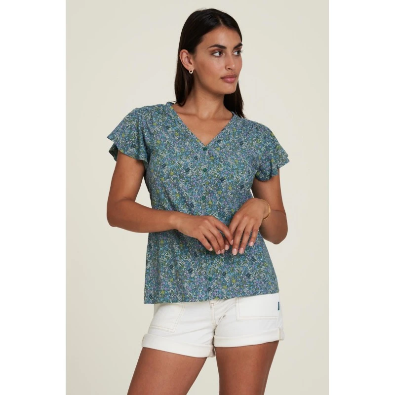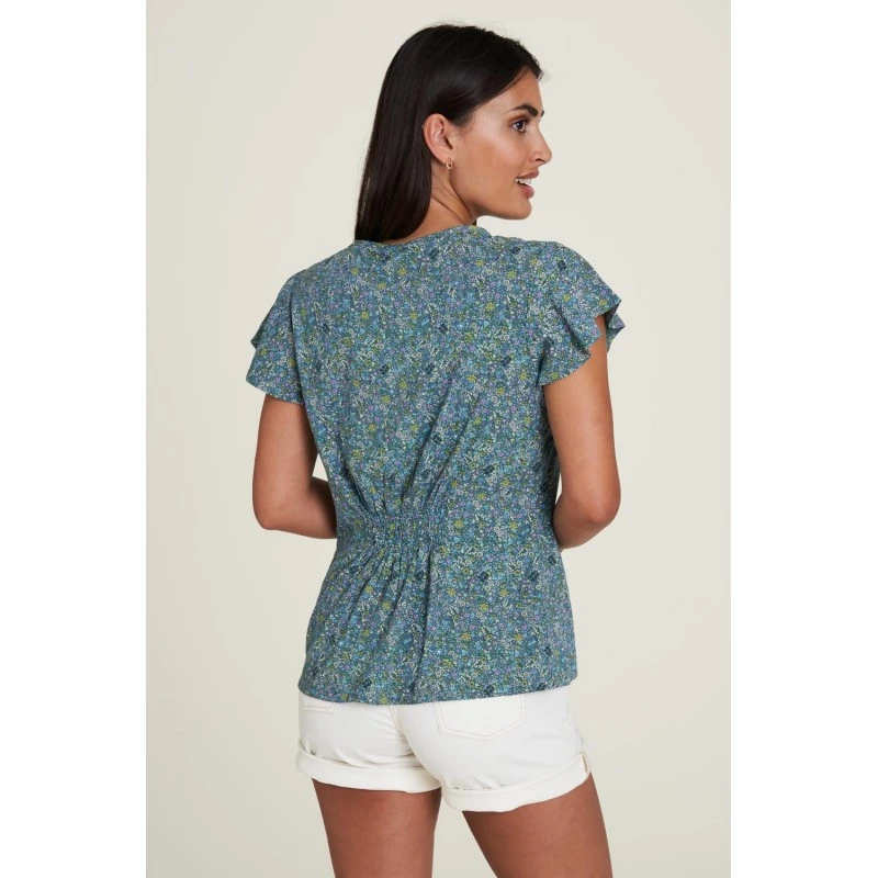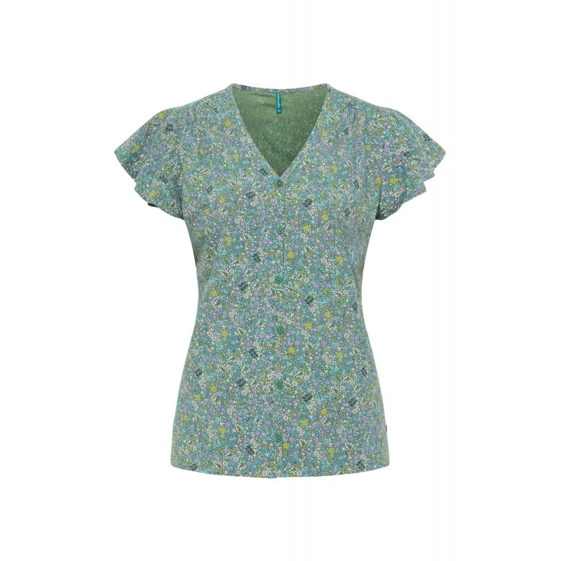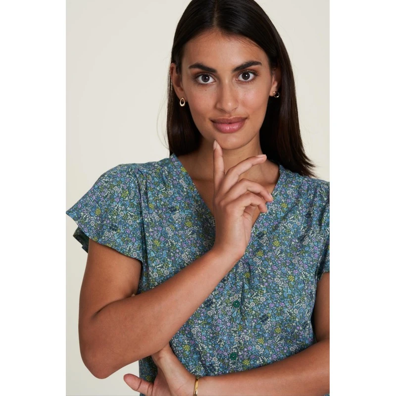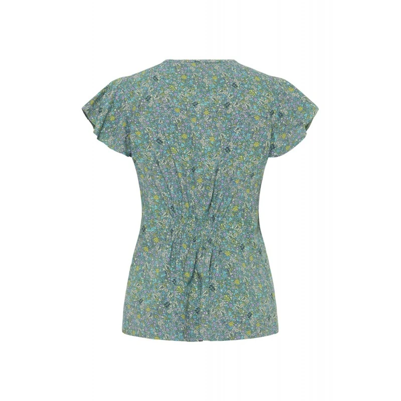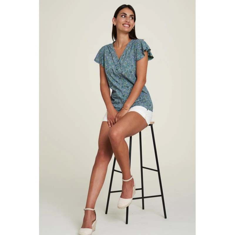 Description : col en v, manches courtes et ornées de plis et détails , patte de boutonnage sur toute la longueur, des plis au dos. Coupe ample.