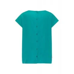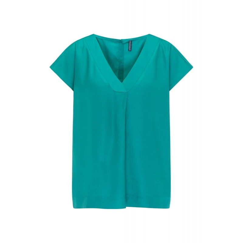 Description : manches courtes, col en V devant, arrondi derriĂšre, des boutons au dos, un pli sur le devant.
