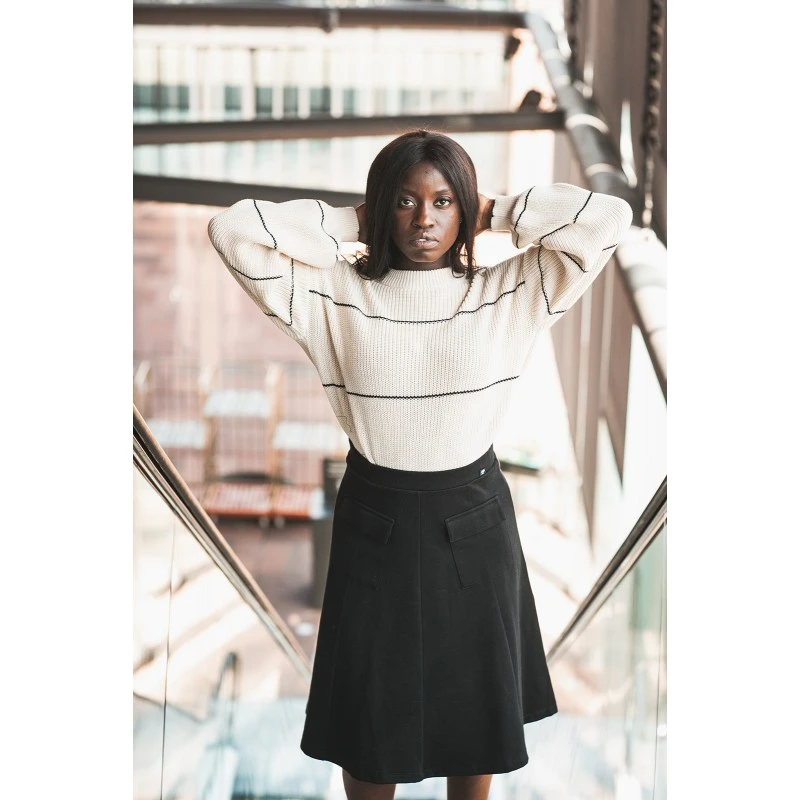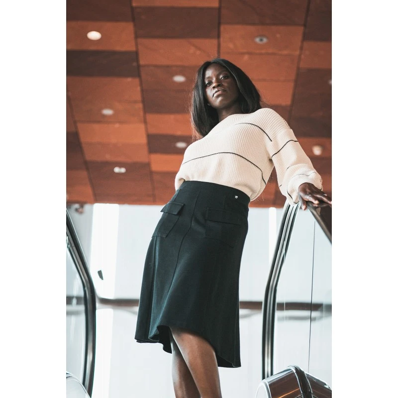 Description : une ceinture élastiquée pour le confort, des poches et un pli central pour le style