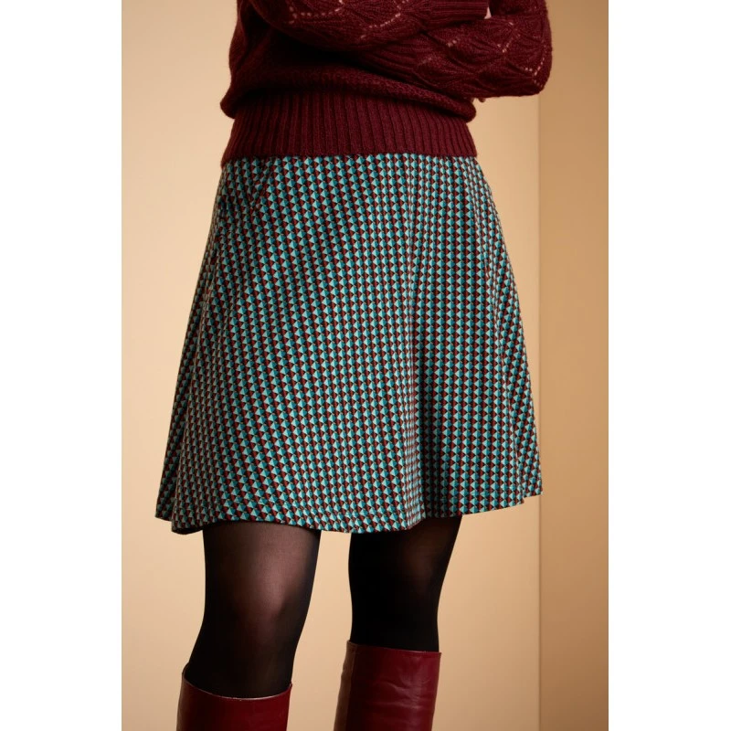 Une jupe évasée, des poches cachées, longueur au-dessus du genou.