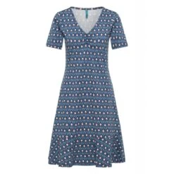 Description : robe trapĂšze, col en V, manches courtes, volants subtils en bas de robe, longueur midi
