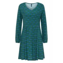 Des plis sur la partie jupe, un décolleté en V, des poignets étroits et boutonnables sur les manches.
