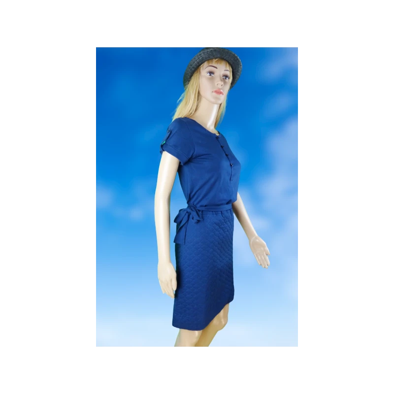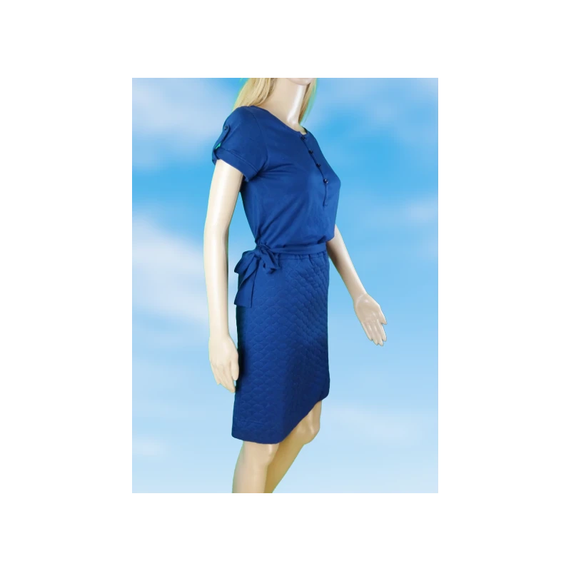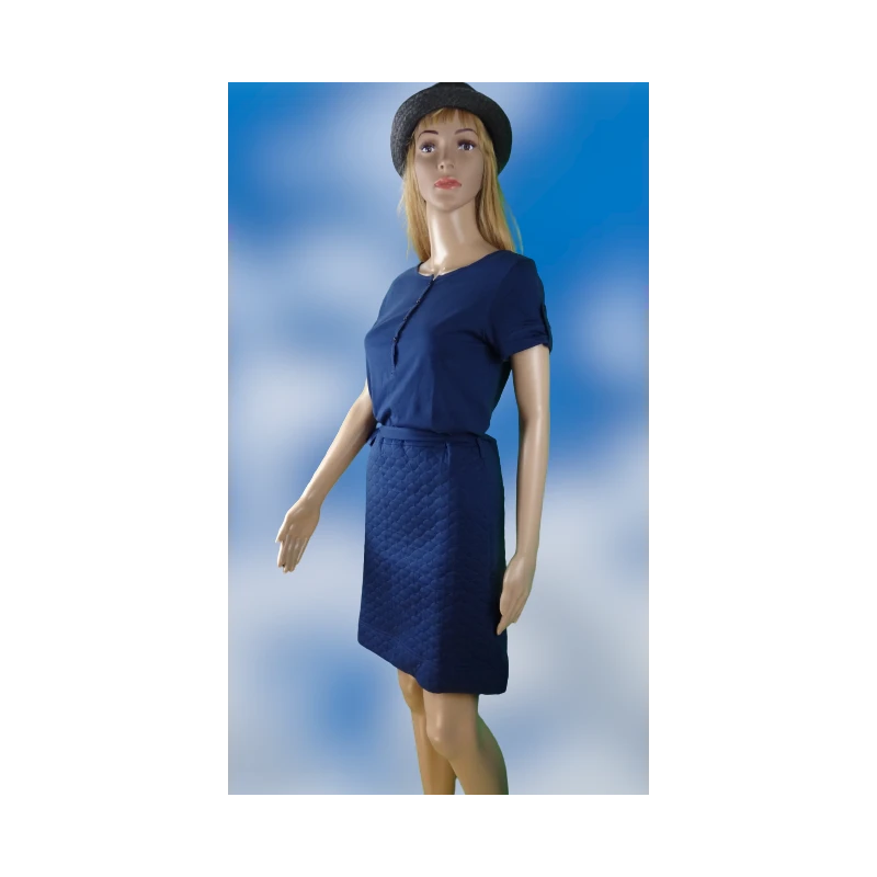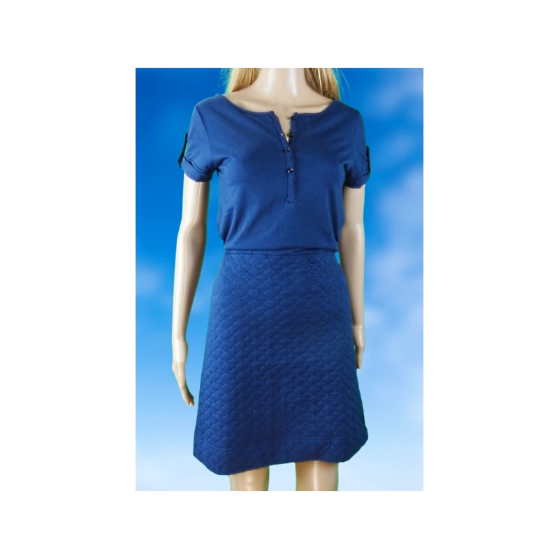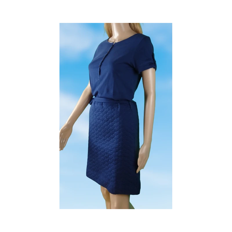 Deux parties : des manches courtes, un haut style tee-shirt, agrémenté de petites épaulettes, un bas style matelassé qui arrive au dessus des genoux. Col fermé par 4 boutons-pression