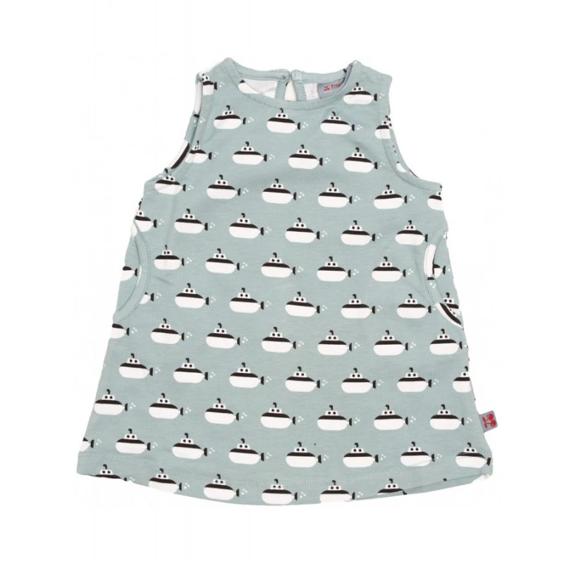 Le Tissu lĂ©gĂšrement Ă©lastique, et le bouton dans le dos permet un habillage plus facile. On aime les poches sur le cĂŽtĂ© et l’imprimĂ© Submarine (petits sous-marins), sur une belle couleur douce gris clair.