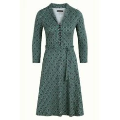 Description : Une robe trÚs évasée à manches 3/4, fermeture boutonniÚre, et col de type chùle.