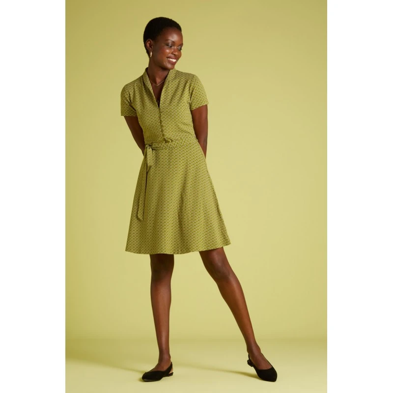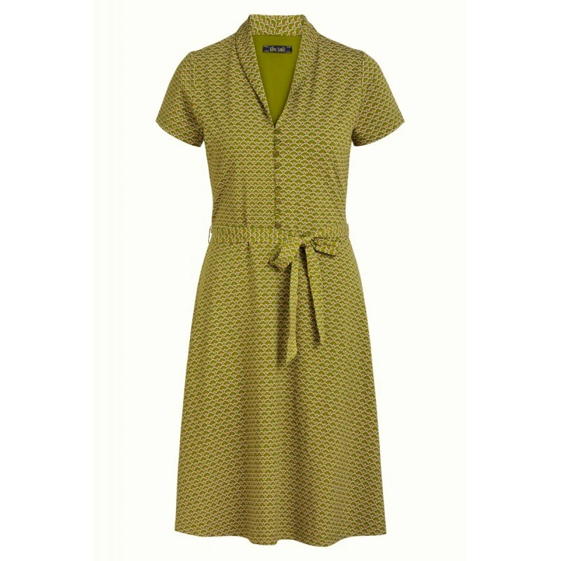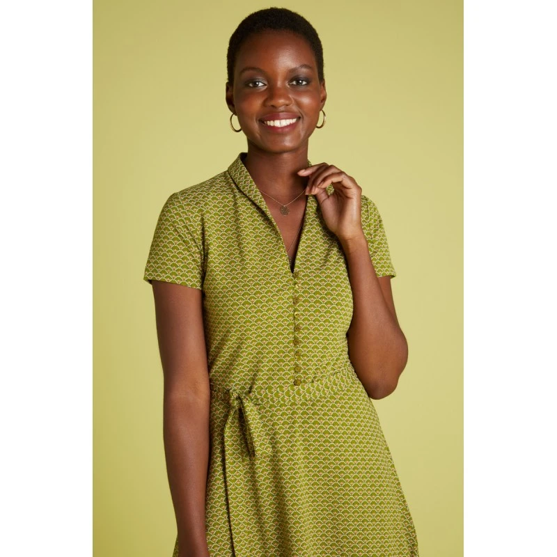 Description : Une robe trÚs évasée à manches courtes, fermeture boutonniÚre, et col de type chùle.