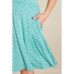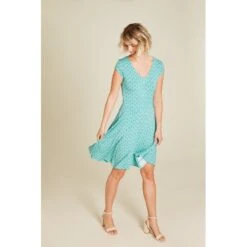 Description : col en V, forme TrapÚze, découpé au dos, tombé élégant, des plis sur la jupe légÚrement évasée, une ceinture et couture de séparation à la taille.