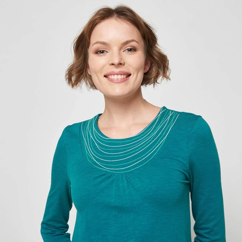 Une coupe droite, des broderie autour du col embellisse cette robe.