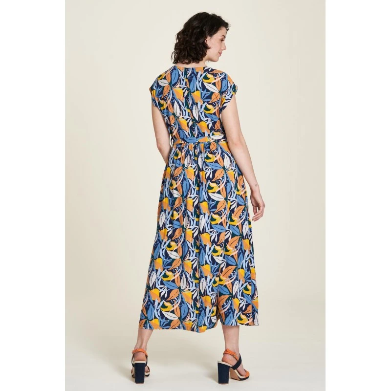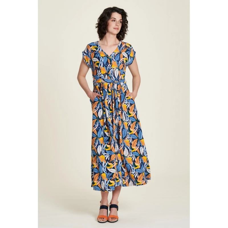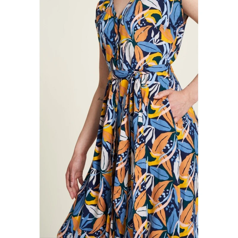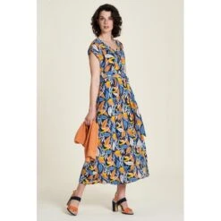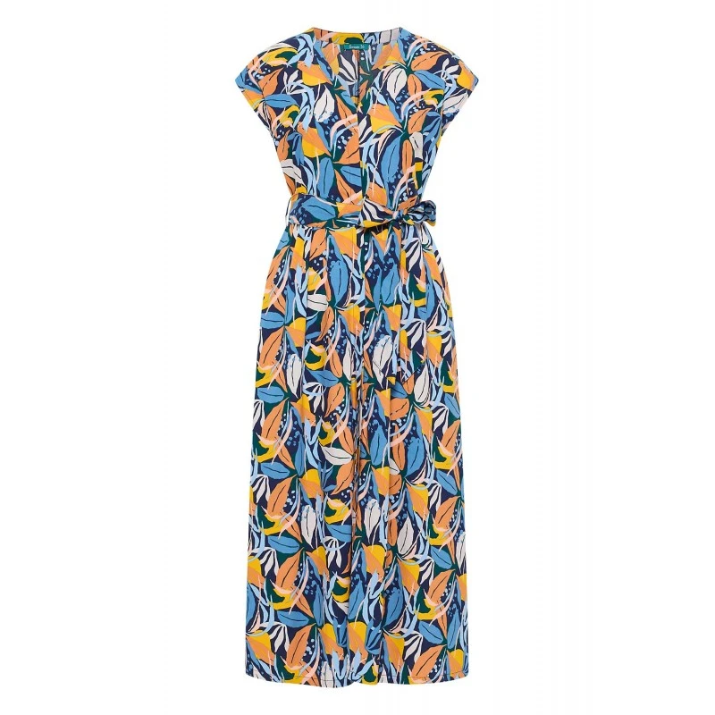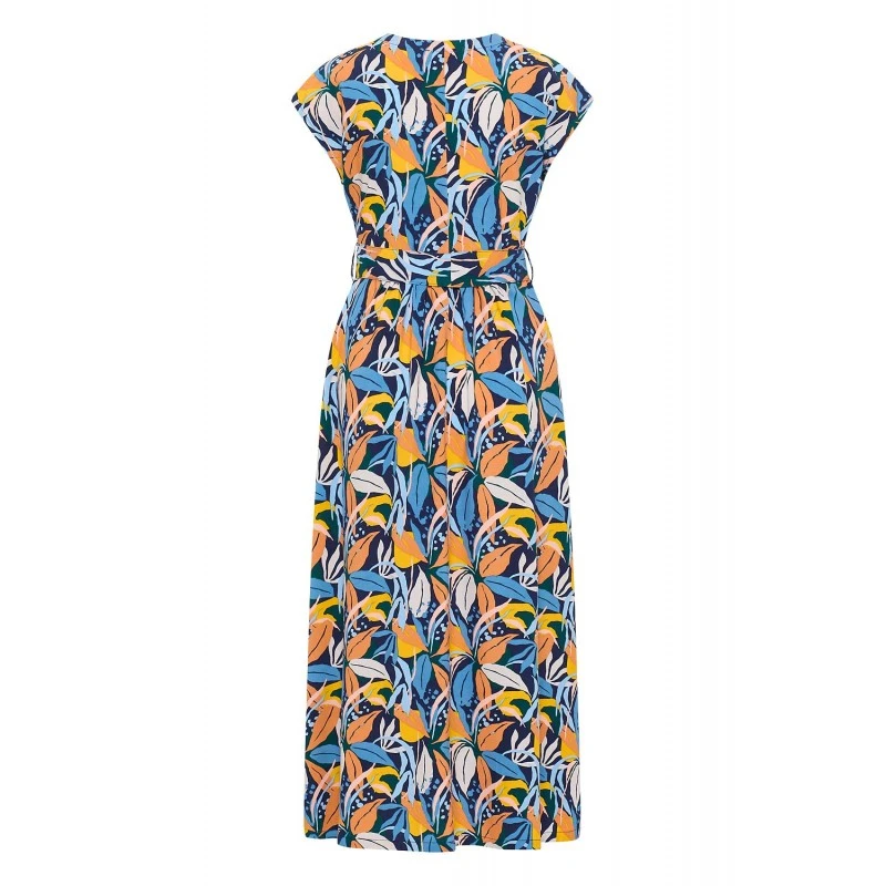 Description : légÚrement évasée, des plis en creux, une ceinture à nouer imprimée, entiÚrement boutonnable. Longueur midi.