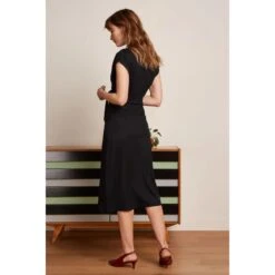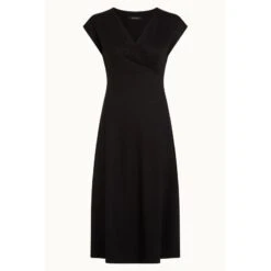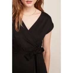 Description : robe portefeuille sans manche, une ceinture Ă nouer, longueur : midi, col en V, unie.
