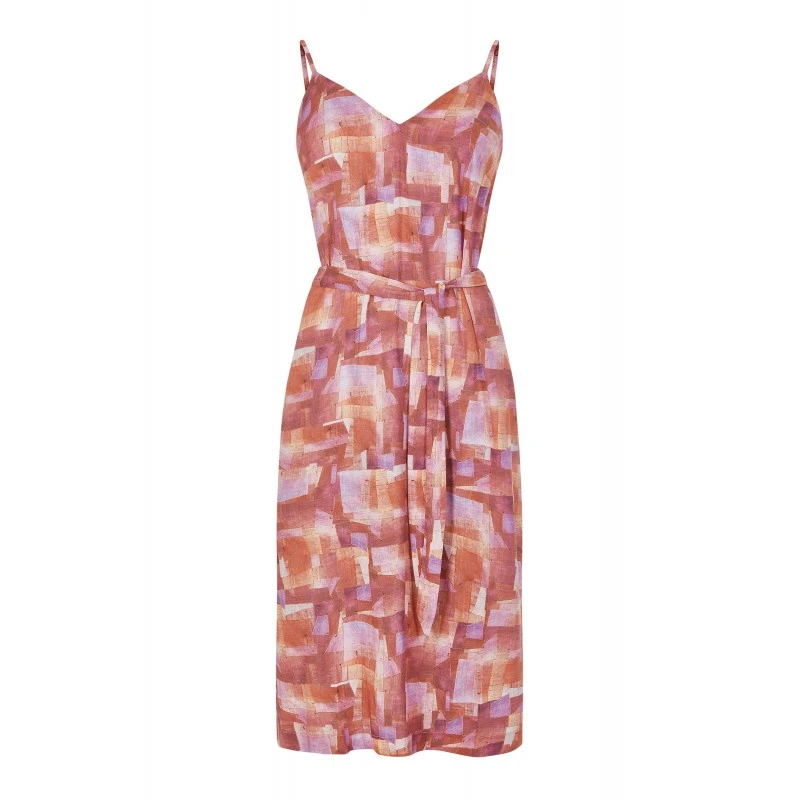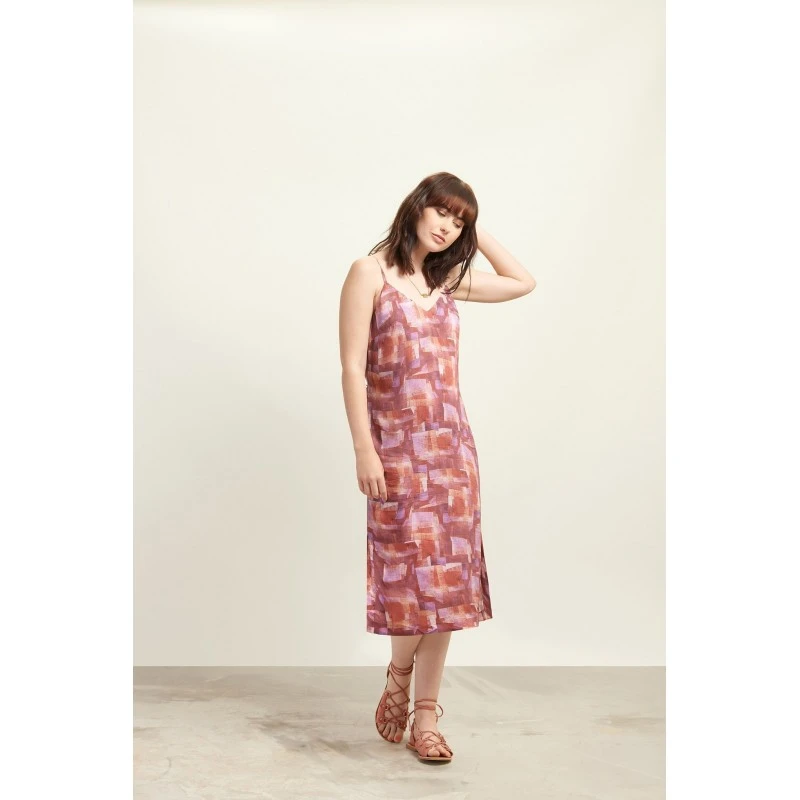 Un col en V, des bretelles et une ceinture en tissu, avec des fentes latérales.