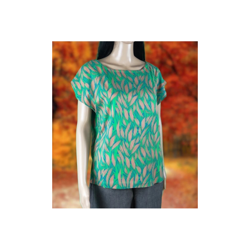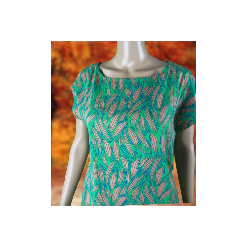 Description : col arrondi, manches courtes, motif feuilles sur fond vert