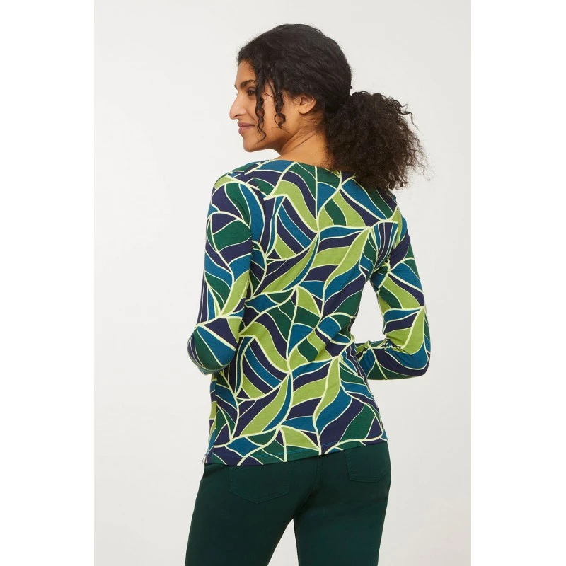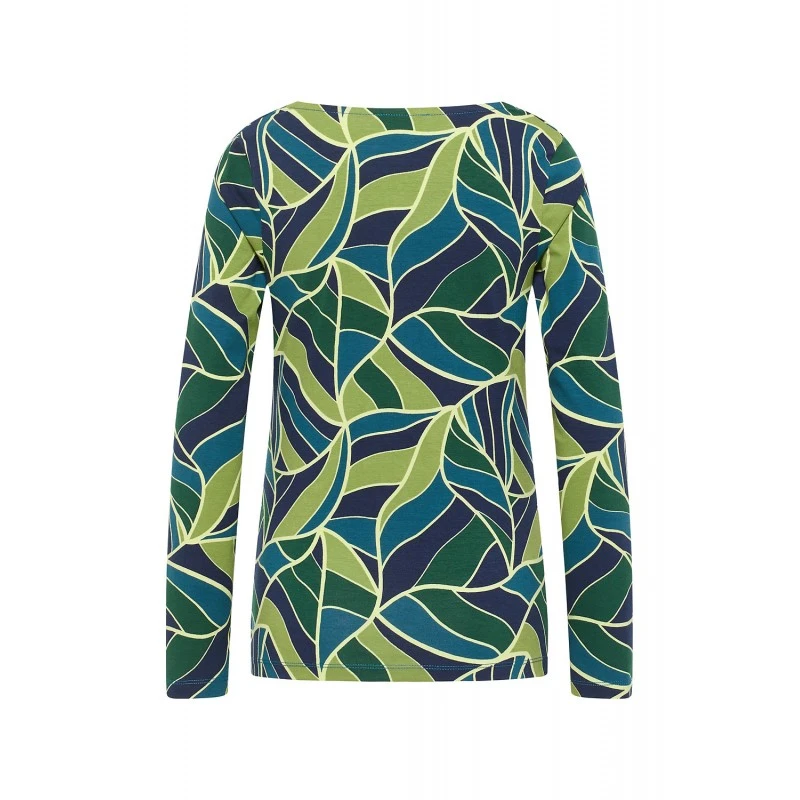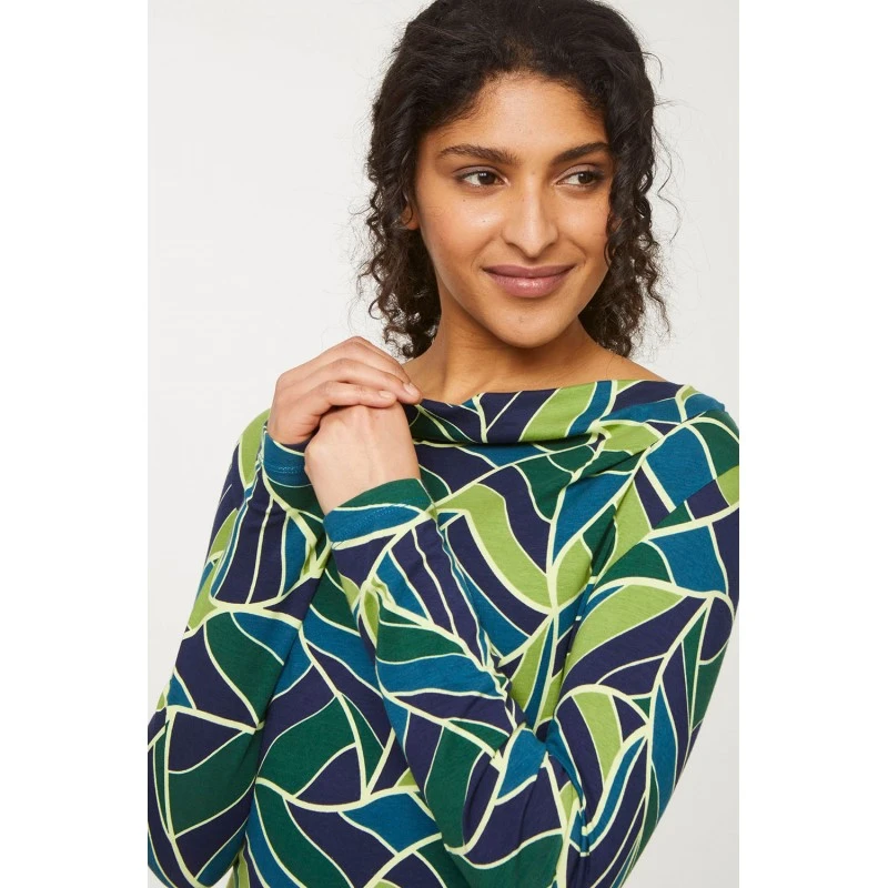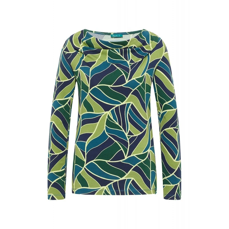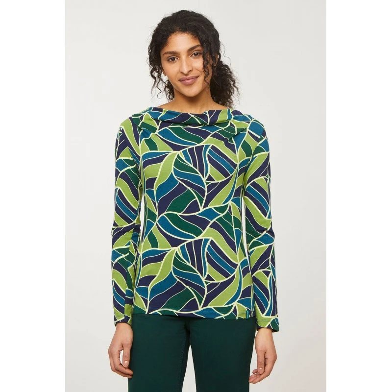 Description : manches longues, col cascade, imprimé végétal