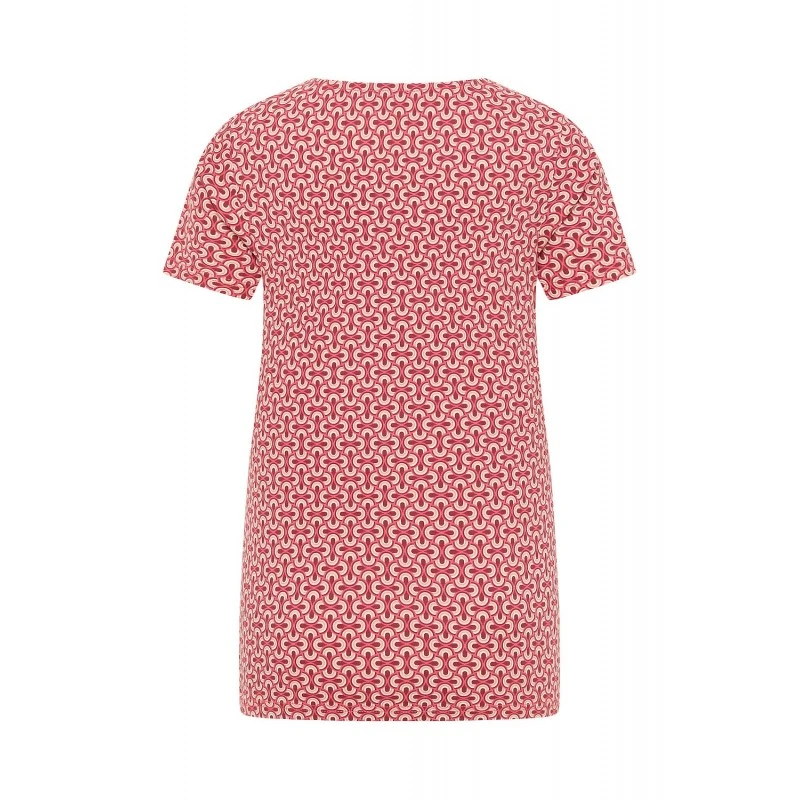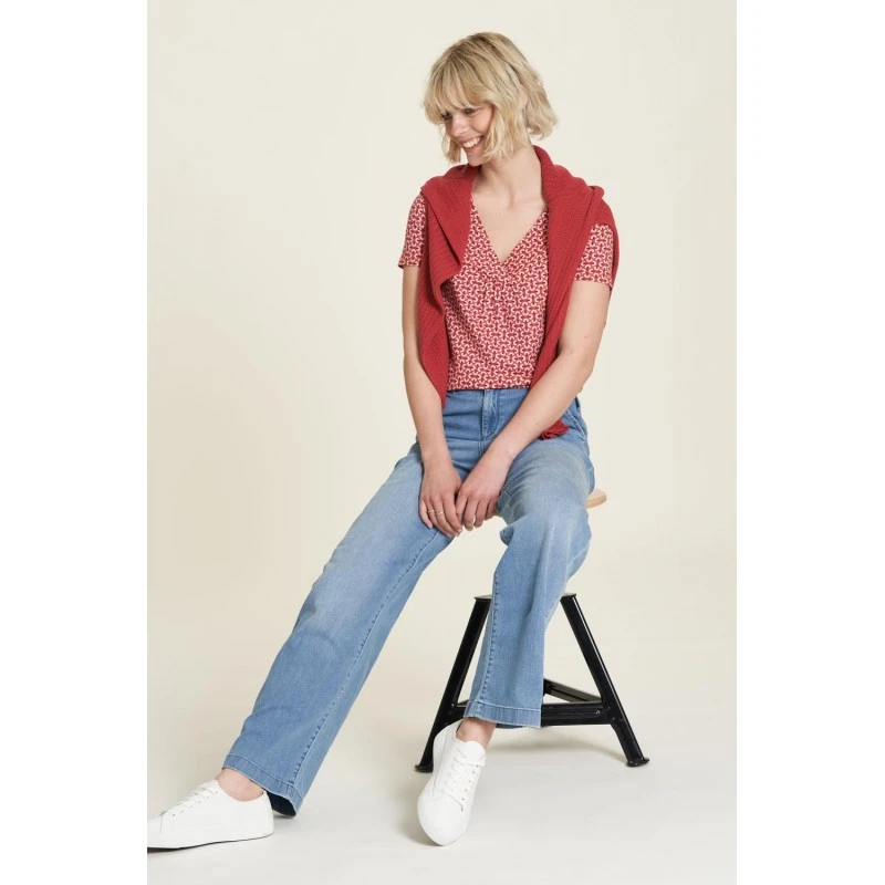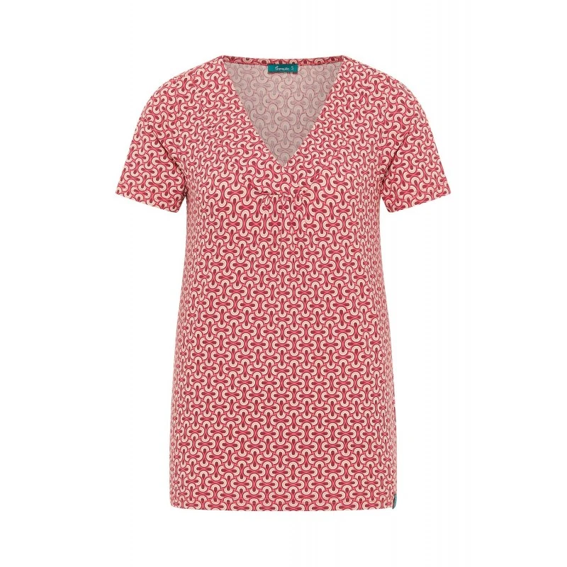 Description : manches courtes, coupe droite, col en V avec design cache-coeur et plis horizontaux