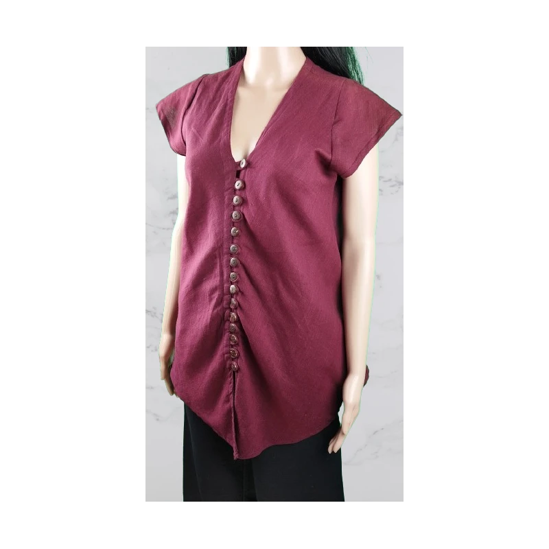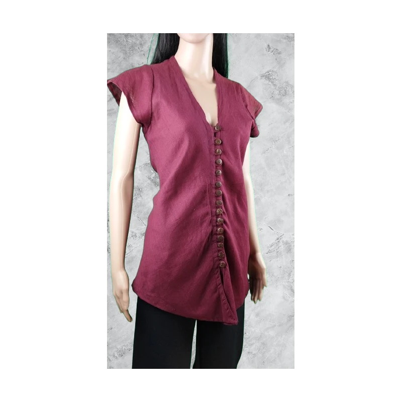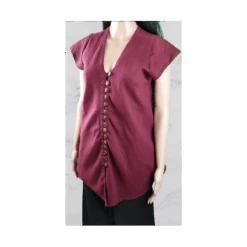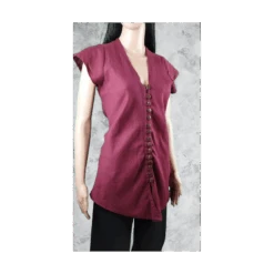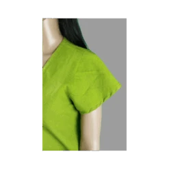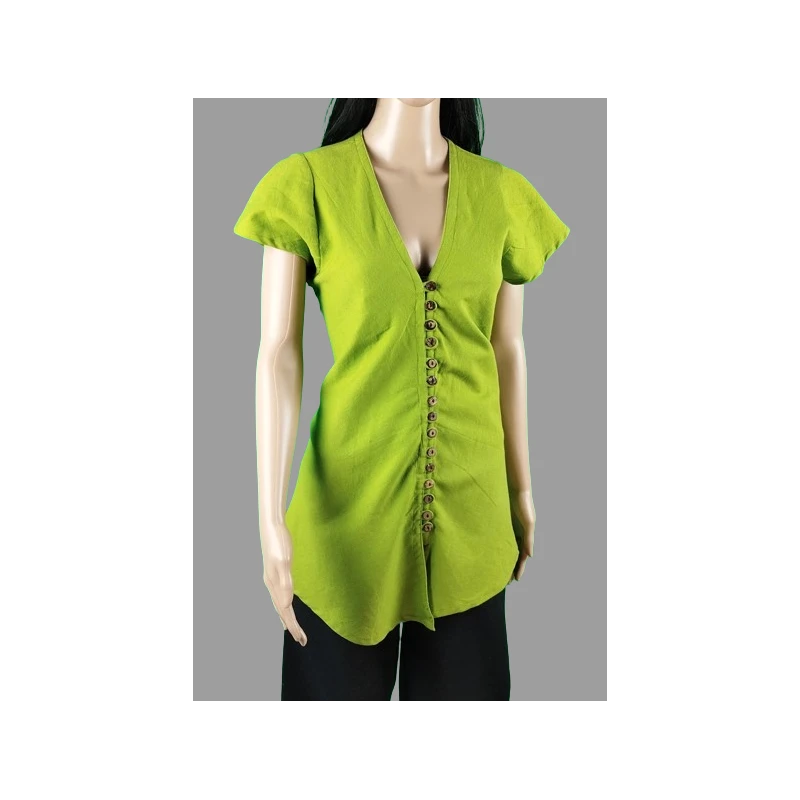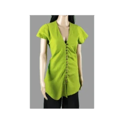 Description : une coupe resserrée à la taille, évasée en bas, une belle longueur, des boutons de fermeture, un col V et des manches courtes retombantes