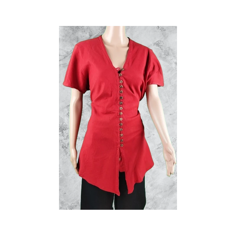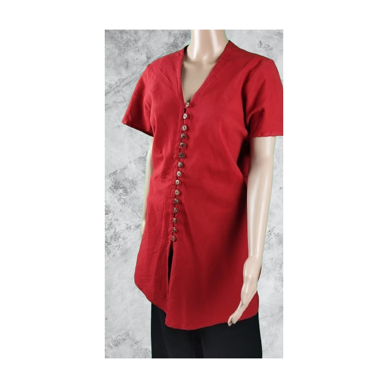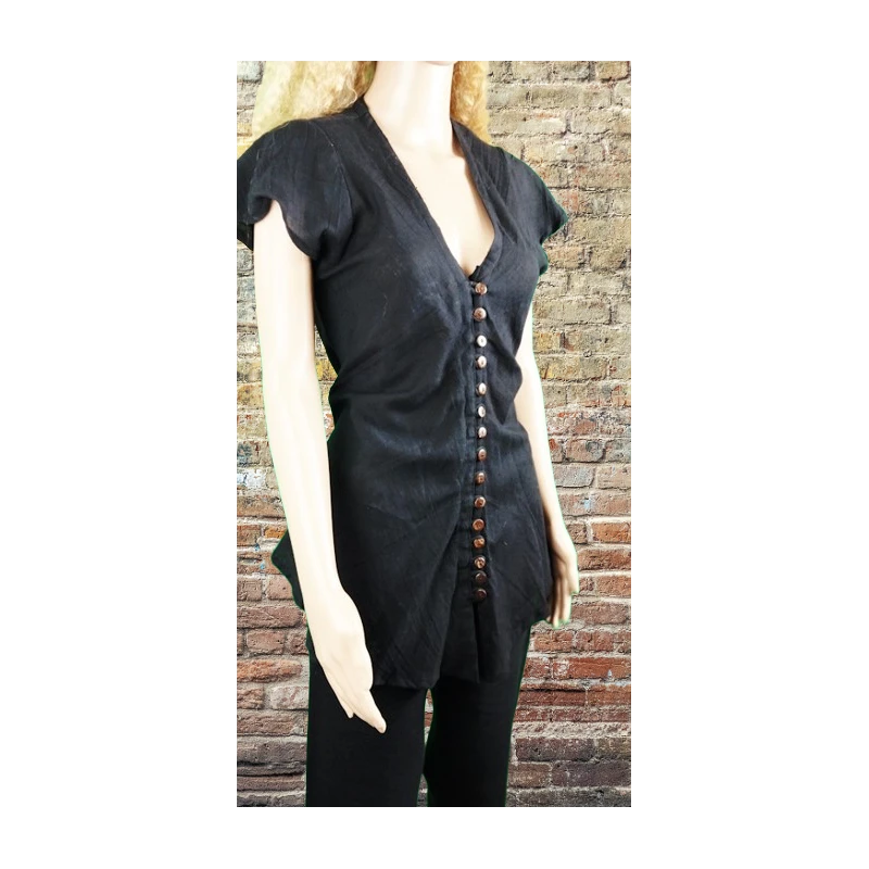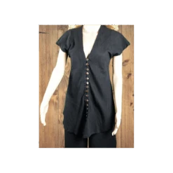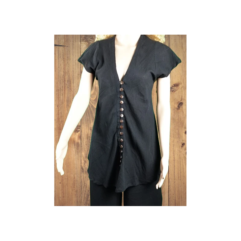 Description : une coupe resserrée à la taille, évasée en bas, une belle longueur, des boutons de fermeture, un col V et des manches courtes.