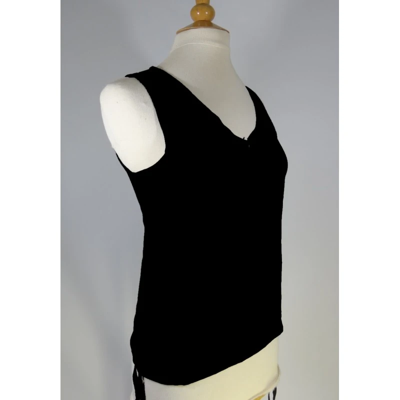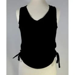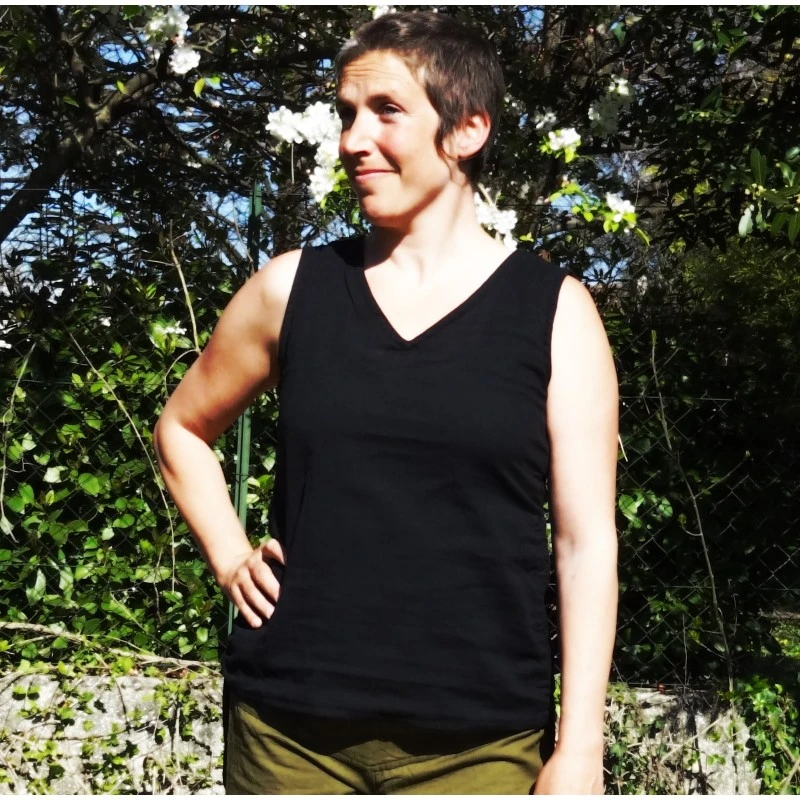 Sans manches, un col en V, et deux façons de le porter : un cordon latéral de serrage permet de laisser droit ou de remonter les cÎtés.