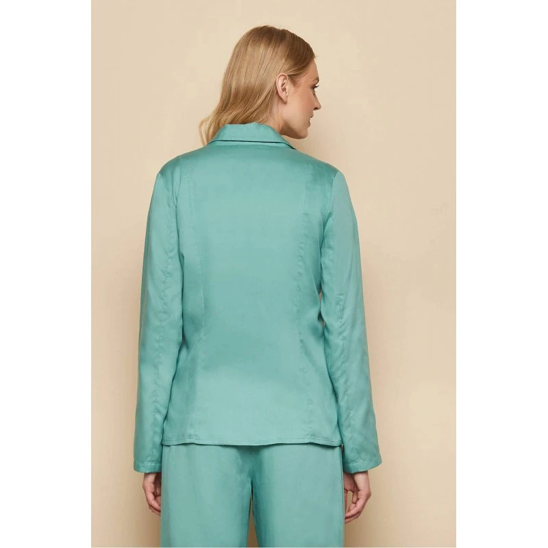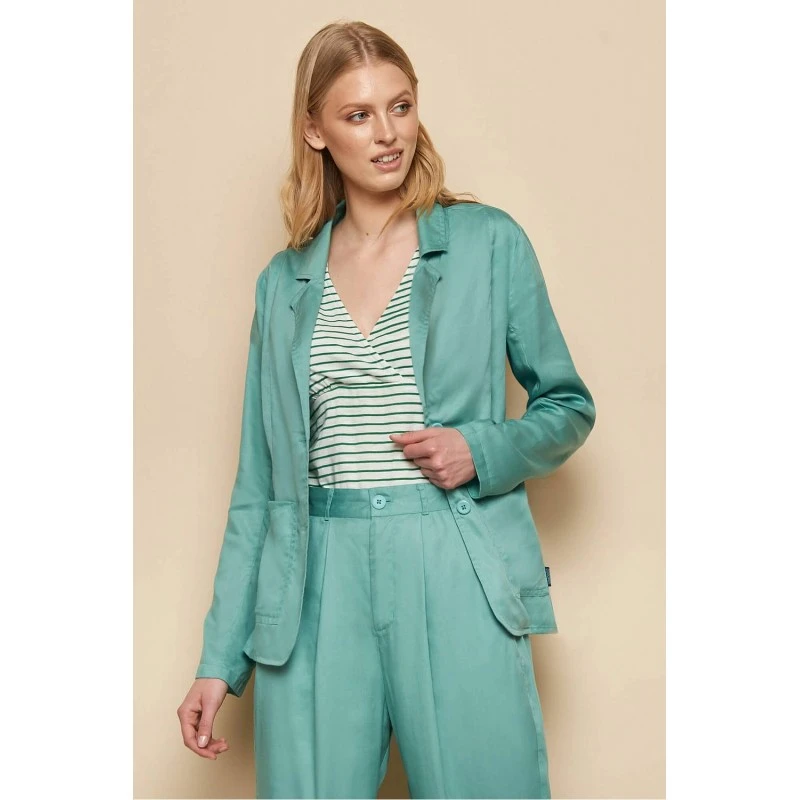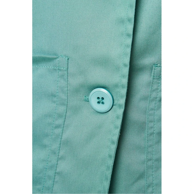 Une coupe cintrée, un col à revers, des poches latérales, et des boutons de fermeture.
