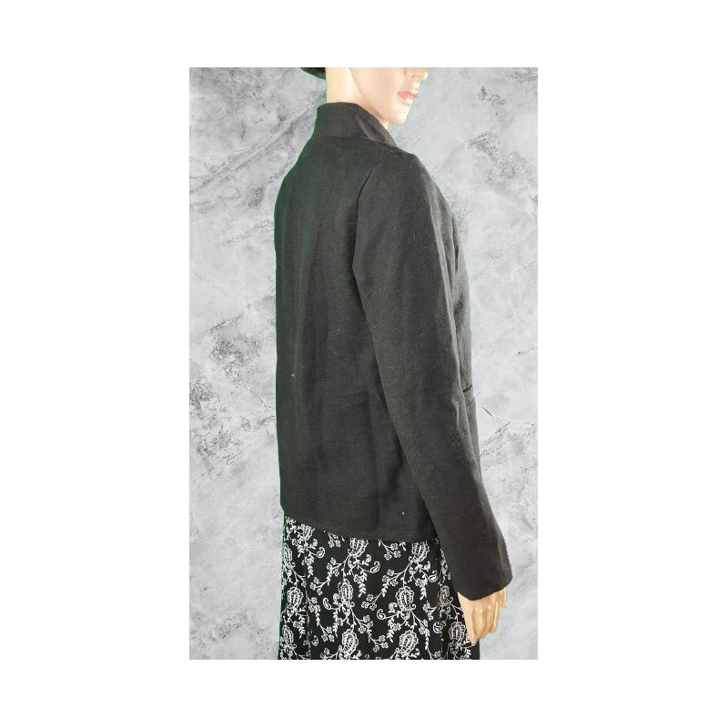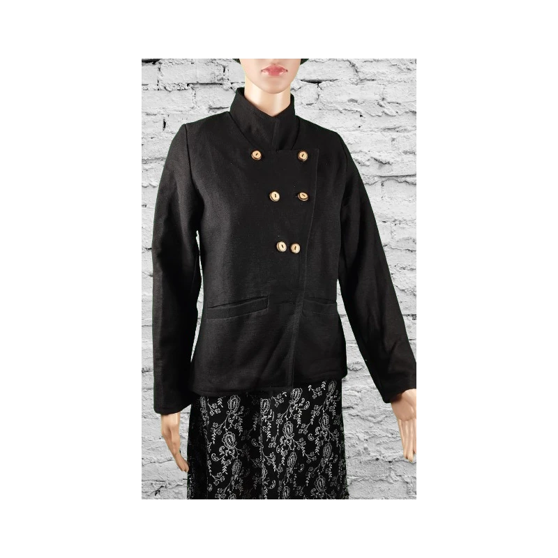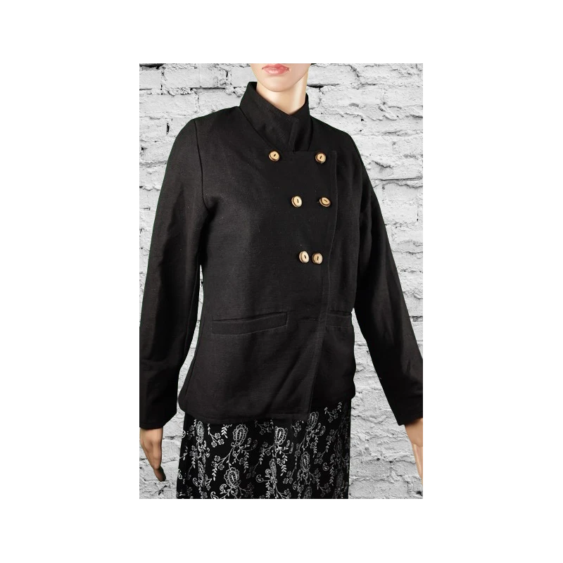 Description : 2 rangées de 3 boutons en bois, une fermeture légÚrement asymétrique, un col montant doux, deux poches latérales et une doublure en soie.